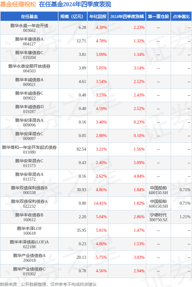证券之星消息,日前鹏华双债保利债券B基金公布四季报,2024年四季度最新规模30.93亿元,季度净值涨幅为1.84%。
