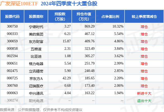 从基金规模来看,广发深证100ETF基金2024年四季度公布的基金规模为0.84亿元,较上一期规模8101.7万元变化了323.21万元,环比变化了3.99%。该基金最新一期资产配置为:股票占净值比99.28%,无债券类资产,现金占净值比0.8%。从基金持仓来看,该基金当季前十大股票仓位达40.22%,第一大重仓股为宁德时代(300750),持仓占比为10.32%。