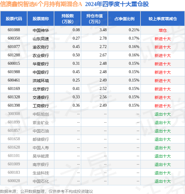 从基金规模来看,信澳鑫悦智选6个月持有期混合A基金2024年四季度公布的基金规模为0.02亿元,较上一期规模87.03万元变化了103.31万元,环比变化了118.72%。该基金最新一期资产配置为:股票占净值比10.67%,债券占净值比63.23%,现金占净值比21.51%。从基金持仓来看,该基金当季前十大股票仓位达1.6%,第一大重仓股为中国神华(601088),持仓占比为0.21%。