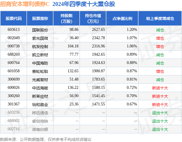 从基金规模来看,招商安本增利债券C基金2024年四季度公布的基金规模为13.51亿元,较上一期规模9.57亿元变化了3.94亿元,环比变化了41.12%。该基金最新一期资产配置为:股票占净值比19.78%,债券占净值比88.43%,现金占净值比0.31%。从基金持仓来看,该基金当季前十大股票仓位达8.87%,第一大重仓股为国联股份(603613),持仓占比为1.2%。