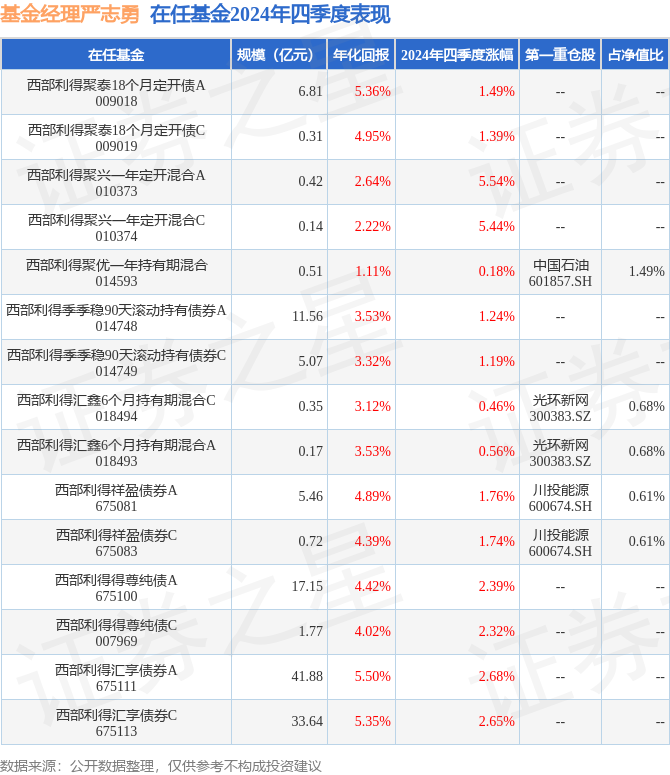 西部利得祥盈债券A现任基金经理为严志勇 计旭,本季度增聘基金经理计旭。其中在任基金经理严志勇已从业7年又169天,2023年8月19日正式接手管理西部利得祥盈债券A,任职期间累计回报为5.23%。目前还管理着15只基金产品(包括A类和C类),其中本季度表现最佳的基金为西部利得聚兴一年定开混合A(010373),季度净值涨幅为5.54%。