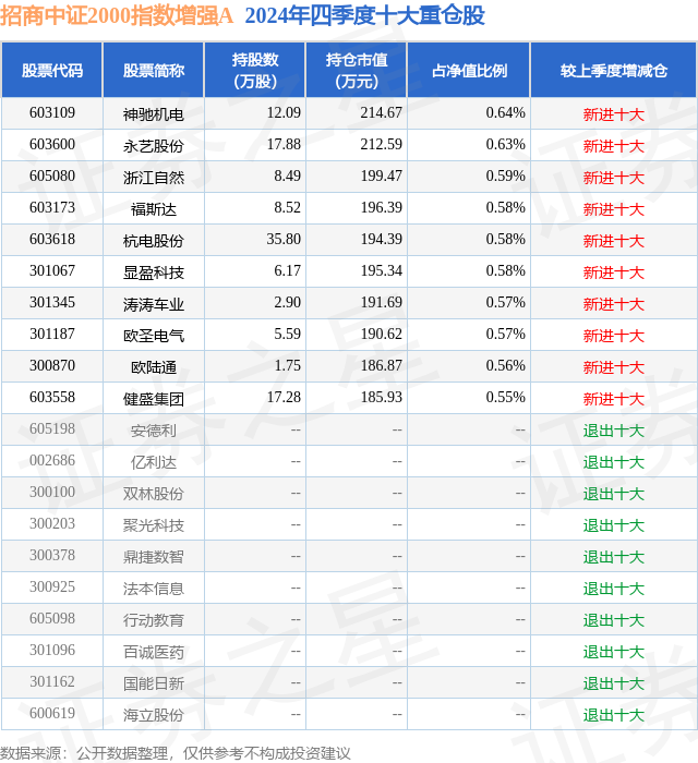 从基金规模来看,招商中证2000指数增强A基金2024年四季度公布的基金规模为0.58亿元,较上一期规模7178.81万元变化了-1366.18万元,环比变化了-19.03%。该基金最新一期资产配置为:股票占净值比94.71%,无债券类资产,现金占净值比8.53%。从基金持仓来看,该基金当季前十大股票仓位达5.85%,第一大重仓股为神驰机电(603109),持仓占比为0.64%。