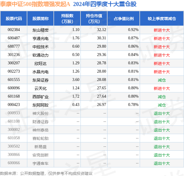 从基金规模来看,泰康中证500指数增强发起A基金2024年四季度公布的基金规模为0.24亿元,较上一期规模3418.71万元变化了-978.75万元,环比变化了-28.63%。该基金最新一期资产配置为:股票占净值比91.32%,无债券类资产,现金占净值比15.62%。从基金持仓来看,该基金当季前十大股票仓位达8.32%,第一大重仓股为东山精密(002384),持仓占比为0.92%。