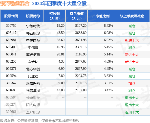 从基金规模来看,银河稳健混合基金2024年四季度公布的基金规模为6.07亿元,较上一期规模6.18亿元变化了-1158.82万元,环比变化了-1.87%。该基金最新一期资产配置为:股票占净值比74.17%,债券占净值比21.92%,现金占净值比4.17%。从基金持仓来看,该基金当季前十大股票仓位达50.86%,第一大重仓股为宁德时代(300750),持仓占比为8.42%。