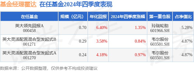 证券之星消息,日前英大领先回报A基金公布四季报,2024年四季度最新规模0.7亿元,季度净值涨幅为1.35%。