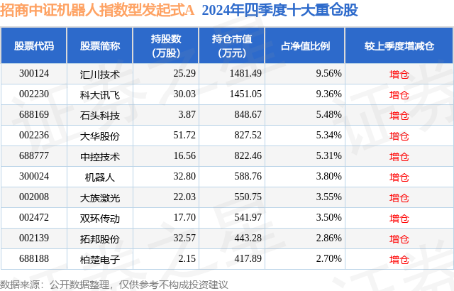 证券之星消息,日前招商中证机器人指数型发起式A基金公布四季报,2024年四季度最新规模0.54亿元,季度净值涨幅为6.83%。