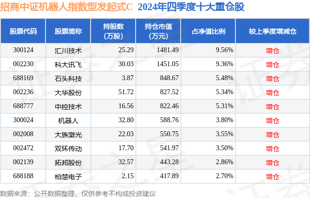 证券之星消息,日前招商中证机器人指数型发起式C基金公布四季报,2024年四季度最新规模1.01亿元,季度净值涨幅为6.75%。