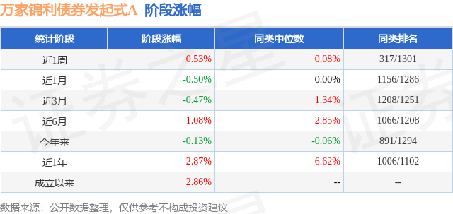 从业绩表现来看,万家锦利债券发起式A基金过去一年净值涨幅为2.87%,在同类基金中排名1006/1102,同类基金过去一年净值涨幅中位数为6.62%。而基金过去一年的最大回撤为-2.49%,成立以来的最大回撤为-2.49%。