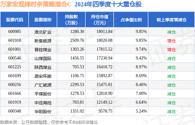 从基金规模来看,万家宏观择时多策略混合C基金2024年四季度公布的基金规模为3.86亿元,较上一期规模6.15亿元变化了-2.29亿元,环比变化了-37.22%。该基金最新一期资产配置为:股票占净值比94.88%,无债券类资产,现金占净值比6.21%。从基金持仓来看,该基金当季前十大股票仓位达83.86%,第一大重仓股为淮北矿业(600985),持仓占比为9.85%。