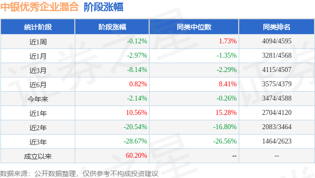 从业绩表现来看,中银优秀企业混合基金过去一年净值涨幅为10.56%,在同类基金中排名2704/4120,同类基金过去一年净值涨幅中位数为15.28%。而基金过去一年的最大回撤为-16.08%,成立以来的最大回撤为-53.03%。