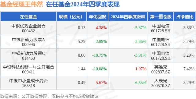 证券之星消息,日前中银优秀企业混合基金公布四季报,2024年四季度最新规模0.13亿元,季度净值涨幅为-5.87%。