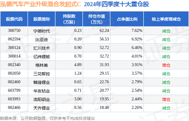 证券之星消息,日前泓德汽车产业升级混合发起式C基金公布四季报,2024年四季度最新规模0.0亿元,季度净值涨幅为-1.37%。