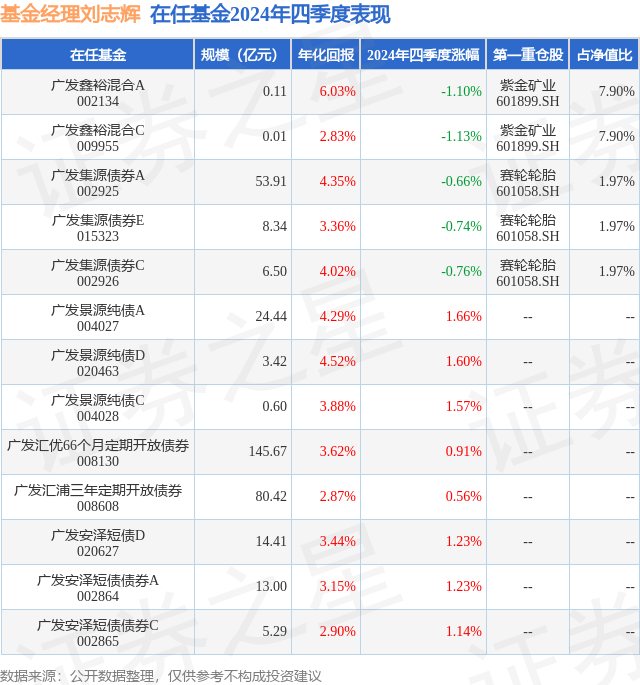 广发集源债券A现任基金经理为刘志辉。其中在任基金经理刘志辉已从业8年又69天,2017年2月6日正式接手管理广发集源债券A,任职期间累计回报为40.56%。目前还管理着13只基金产品(包括A类和C类),其中本季度表现最佳的基金为广发景源纯债A(004027),季度净值涨幅为1.66%。