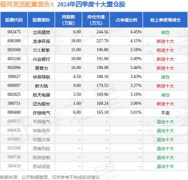 从基金规模来看,银河灵活配置混合A基金2024年四季度公布的基金规模为0.33亿元,较上一期规模3593.06万元变化了-316.61万元,环比变化了-8.81%。该基金最新一期资产配置为:股票占净值比71.94%,债券占净值比12.91%,现金占净值比6.94%。从基金持仓来看,该基金当季前十大股票仓位达35.0%,第一大重仓股为立讯精密(002475),持仓占比为4.45%。