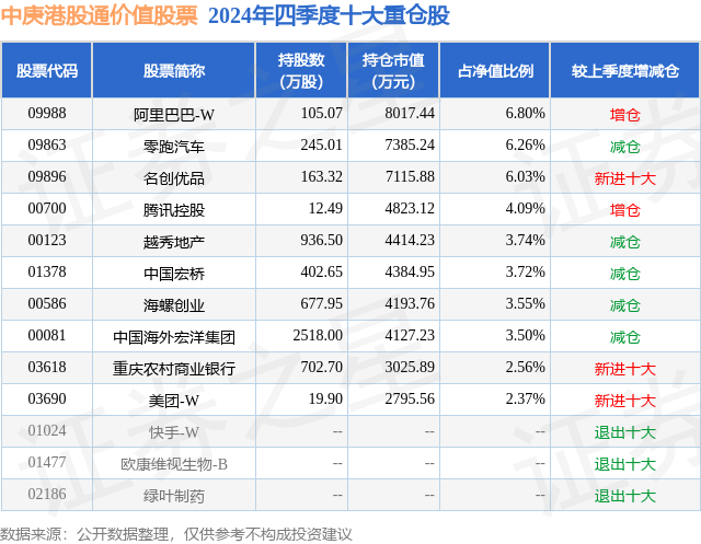 从基金规模来看,中庚港股通价值股票基金2024年四季度公布的基金规模为11.8亿元,较上一期规模14.33亿元变化了-2.53亿元,环比变化了-17.67%。该基金最新一期资产配置为:股票占净值比94.37%,债券占净值比3.56%,现金占净值比2.93%。从基金持仓来看,该基金当季前十大股票仓位达42.62%,第一大重仓股为阿里巴巴-W(09988),持仓占比为6.8%。