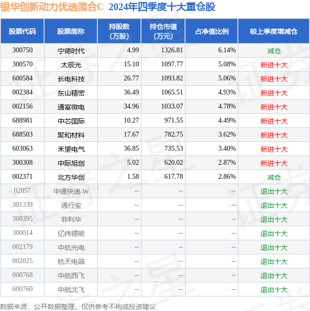 从基金规模来看,银华创新动力优选混合C基金2024年四季度公布的基金规模为0.95亿元,较上一期规模1.03亿元变化了-736.92万元,环比变化了-7.18%。该基金最新一期资产配置为:股票占净值比89.01%,无债券类资产,现金占净值比9.21%。从基金持仓来看,该基金当季前十大股票仓位达43.23%,第一大重仓股为宁德时代(300750),持仓占比为6.14%。