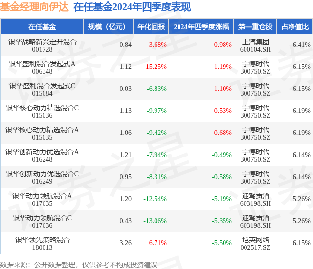 银华创新动力优选混合C现任基金经理为向伊达。其中在任基金经理向伊达已从业5年又45天,2023年1月5日正式接手管理银华创新动力优选混合C,任职期间累计回报为-16.26%。目前还管理着10只基金产品(包括A类和C类),其中本季度表现最佳的基金为银华盛利混合发起式A(006348),季度净值涨幅为1.19%。