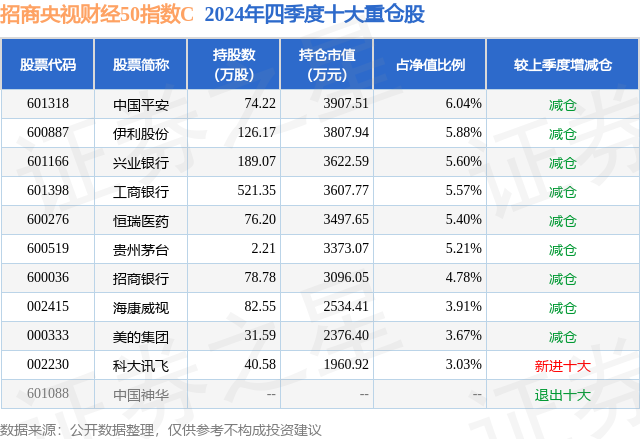 从基金规模来看,招商央视财经50指数C基金2024年四季度公布的基金规模为0.25亿元,较上一期规模3766.73万元变化了-1282.87万元,环比变化了-34.06%。该基金最新一期资产配置为:股票占净值比94.45%,债券占净值比0.71%,现金占净值比4.49%。从基金持仓来看,该基金当季前十大股票仓位达49.09%,第一大重仓股为中国平安(601318),持仓占比为6.04%。