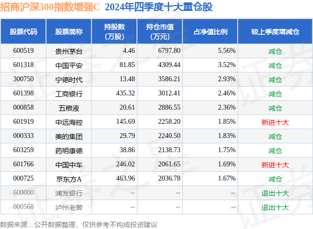 从基金规模来看,招商沪深300指数增强C基金2024年四季度公布的基金规模为5.7亿元,较上一期规模10.41亿元变化了-4.71亿元,环比变化了-45.28%。该基金最新一期资产配置为:股票占净值比94.42%,债券占净值比3.66%,现金占净值比2.62%。从基金持仓来看,该基金当季前十大股票仓位达25.62%,第一大重仓股为贵州茅台(600519),持仓占比为5.56%。
