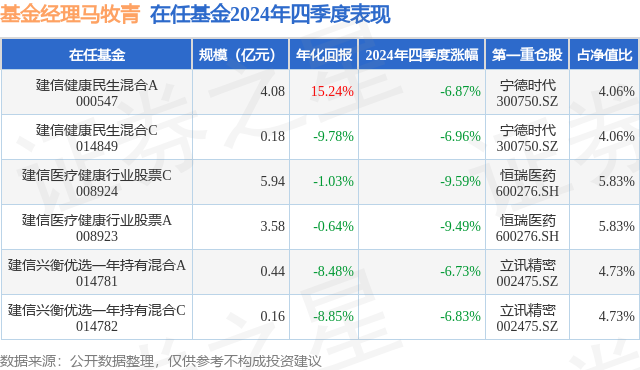 建信健康民生混合A现任基金经理为马牧青。其中在任基金经理马牧青已从业3年又27天,2024年3月29日正式接手管理建信健康民生混合A,任职期间累计回报为-0.02%。目前还管理着6只基金产品(包括A类和C类)。