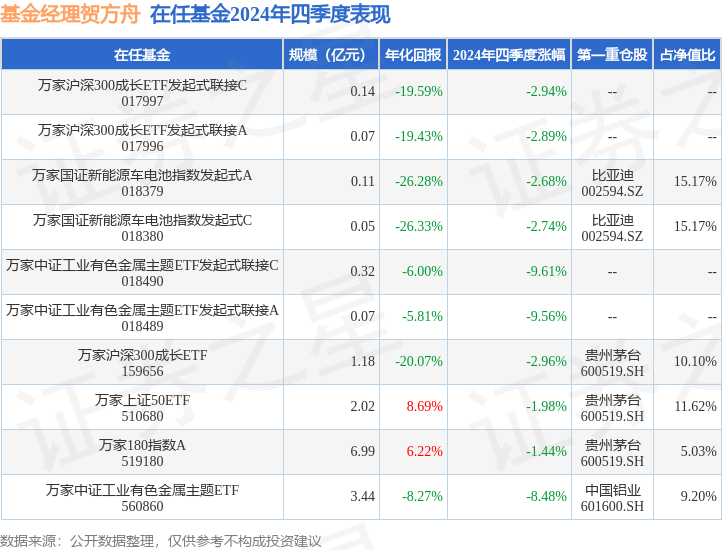 证券之星消息,日前万家180指数A基金公布四季报,2024年四季度最新规模6.99亿元,季度净值涨幅为-1.44%。
