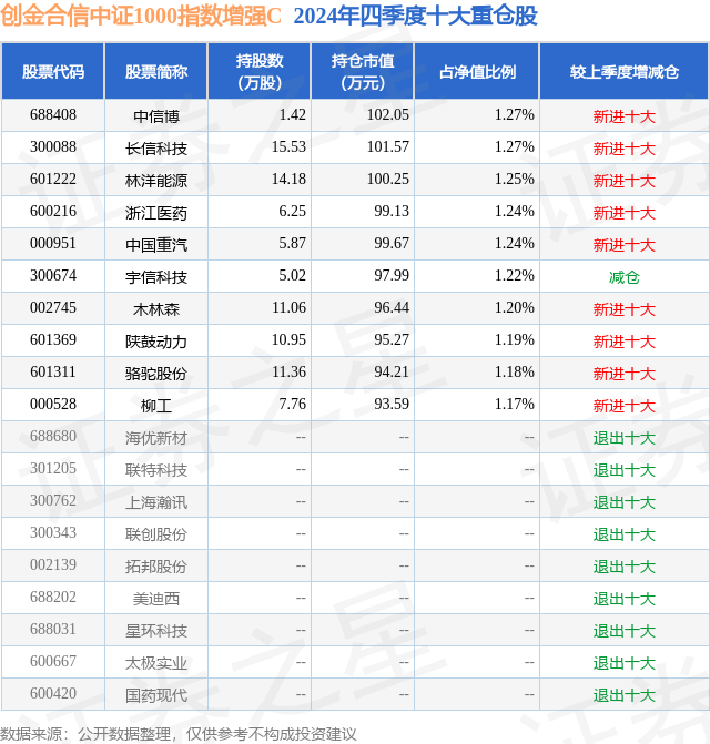 从基金规模来看,创金合信中证1000指数增强C基金2024年四季度公布的基金规模为0.42亿元,较上一期规模3892.21万元变化了266.02万元,环比变化了6.83%。该基金最新一期资产配置为:股票占净值比90.8%,债券占净值比2.04%,现金占净值比7.04%。从基金持仓来看,该基金当季前十大股票仓位达12.23%,第一大重仓股为中信博(688408),持仓占比为1.27%。
