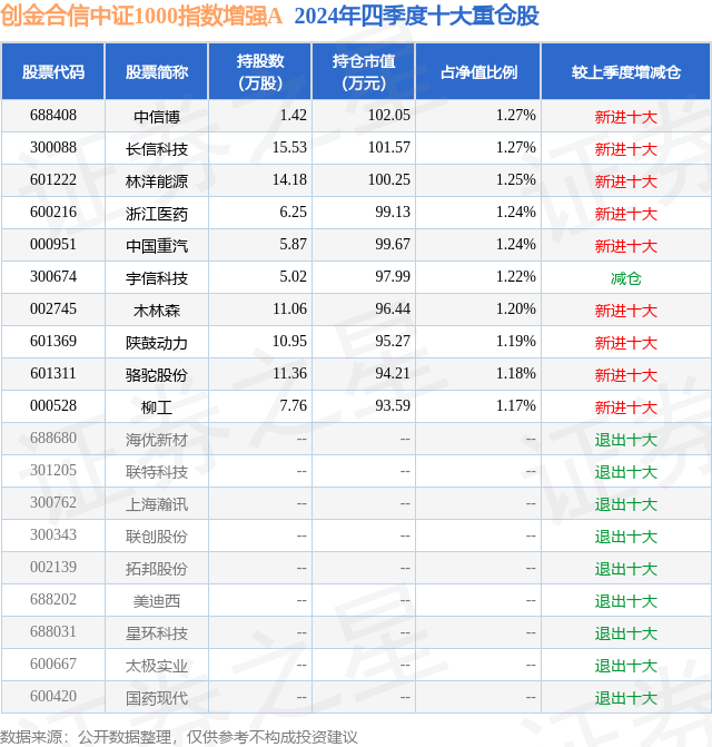 证券之星消息,日前创金合信中证1000指数增强A基金公布四季报,2024年四季度最新规模0.38亿元,季度净值涨幅为6.99%。