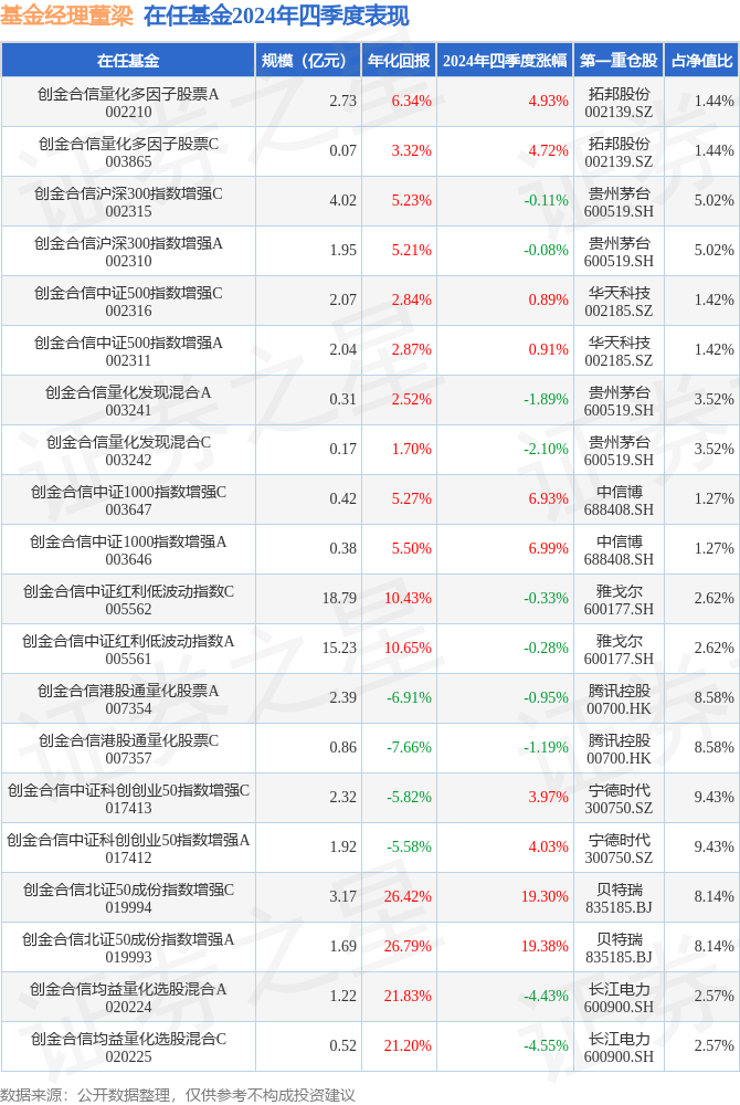 创金合信中证1000指数增强A现任基金经理为董梁 孙悦。其中在任基金经理董梁已从业7年又161天,2019年7月5日正式接手管理创金合信中证1000指数增强A,任职期间累计回报为61.83%。目前还管理着20只基金产品(包括A类和C类),其中本季度表现最佳的基金为创金合信北证50成份指数增强A(019993),季度净值涨幅为19.38%。