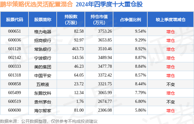 从基金规模来看,鹏华策略优选灵活配置混合基金2024年四季度公布的基金规模为3.94亿元,较上一期规模3.88亿元变化了547.81万元,环比变化了1.41%。该基金最新一期资产配置为:股票占净值比93.32%,无债券类资产,现金占净值比7.8%。从基金持仓来看,该基金当季前十大股票仓位达82.92%,第一大重仓股为格力电器(000651),持仓占比为9.54%。