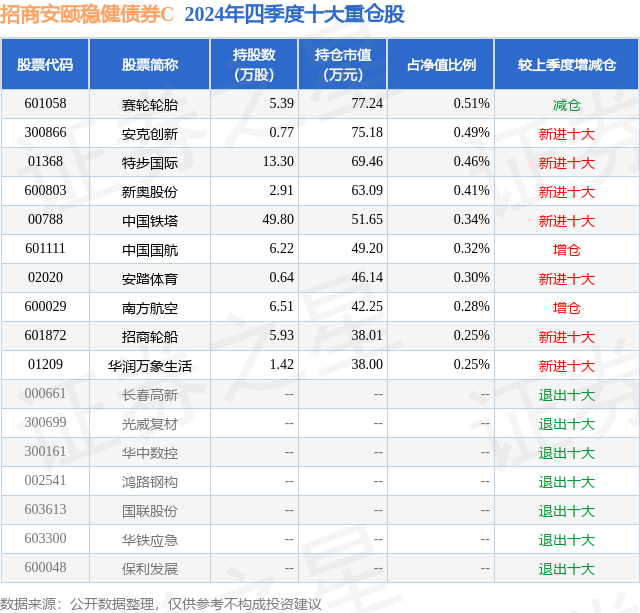 从基金规模来看,招商安颐稳健债券C基金2024年四季度公布的基金规模为0.04亿元,较上一期规模426.33万元变化了9.06万元,环比变化了2.13%。该基金最新一期资产配置为:股票占净值比4.54%,债券占净值比85.76%,现金占净值比1.59%。从基金持仓来看,该基金当季前十大股票仓位达3.61%,第一大重仓股为赛轮轮胎(601058),持仓占比为0.51%。