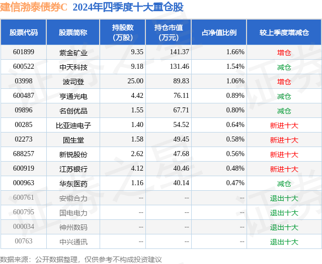 从基金规模来看,建信渤泰债券C基金2024年四季度公布的基金规模为0.09亿元,较上一期规模662.23万元变化了286.76万元,环比变化了43.3%。该基金最新一期资产配置为:股票占净值比13.76%,债券占净值比97.96%,现金占净值比13.49%。从基金持仓来看,该基金当季前十大股票仓位达8.68%,第一大重仓股为紫金矿业(601899),持仓占比为1.66%。