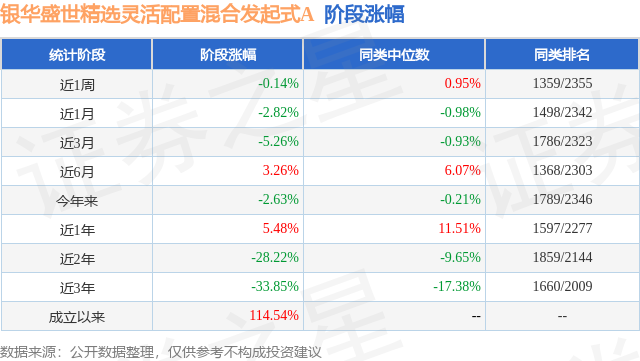 从业绩表现来看,银华盛世精选灵活配置混合发起式A基金过去一年净值涨幅为5.48%,在同类基金中排名1597/2277,同类基金过去一年净值涨幅中位数为11.51%。而基金过去一年的最大回撤为-21.81%,成立以来的最大回撤为-52.76%。
