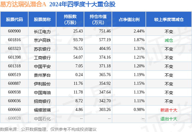 证券之星消息,日前易方达瑞弘混合A基金公布四季报,2024年四季度最新规模2.95亿元,季度净值涨幅为1.61%。
