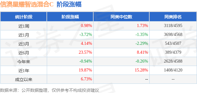 从业绩表现来看,信澳星耀智选混合C基金过去一年净值涨幅为19.87%,在同类基金中排名1408/4120,同类基金过去一年净值涨幅中位数为15.28%。而基金过去一年的最大回撤为-21.43%,成立以来的最大回撤为-27.26%。