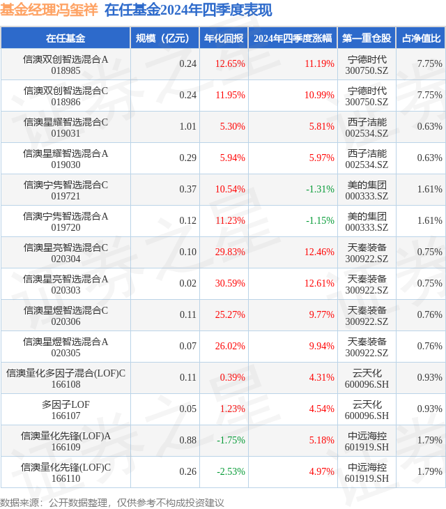 证券之星消息,日前信澳星耀智选混合C基金公布四季报,2024年四季度最新规模1.01亿元,季度净值涨幅为5.81%。