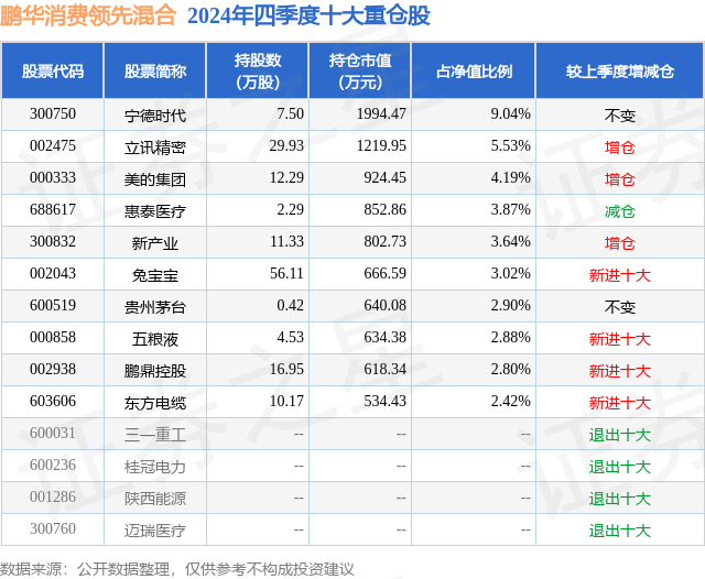 从基金规模来看,鹏华消费领先混合基金2024年四季度公布的基金规模为2.21亿元,较上一期规模2.4亿元变化了-1916.95万元,环比变化了-8.0%。该基金最新一期资产配置为:股票占净值比88.78%,无债券类资产,现金占净值比6.7%。从基金持仓来看,该基金当季前十大股票仓位达40.29%,第一大重仓股为宁德时代(300750),持仓占比为9.04%。