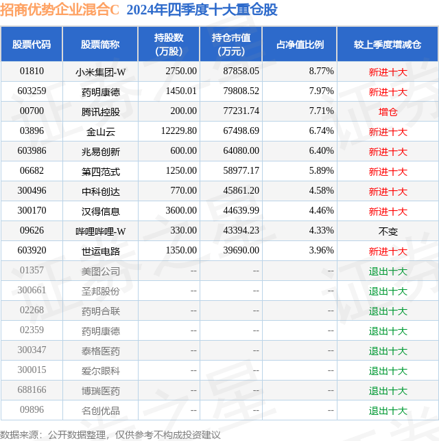 从基金规模来看,招商优势企业混合C基金2024年四季度公布的基金规模为35.92亿元,较上一期规模18.38亿元变化了17.53亿元,环比变化了95.38%。该基金最新一期资产配置为:股票占净值比92.72%,债券占净值比6.54%,现金占净值比3.8%。从基金持仓来看,该基金当季前十大股票仓位达60.81%,第一大重仓股为小米集团-W(01810),持仓占比为8.77%。