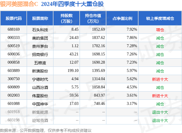 从基金规模来看,银河美丽混合C基金2024年四季度公布的基金规模为0.48亿元,较上一期规模5430.53万元变化了-617.38万元,环比变化了-11.37%。该基金最新一期资产配置为:股票占净值比93.89%,无债券类资产,现金占净值比6.79%。从基金持仓来看,该基金当季前十大股票仓位达60.45%,第一大重仓股为石头科技(688169),持仓占比为7.92%。