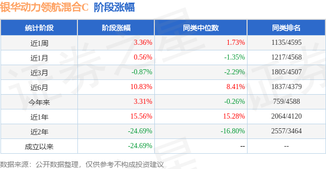 从业绩表现来看,银华动力领航混合C基金过去一年净值涨幅为15.56%,在同类基金中排名2064/4120,同类基金过去一年净值涨幅中位数为15.28%。而基金过去一年的最大回撤为-20.28%,成立以来的最大回撤为-39.37%。