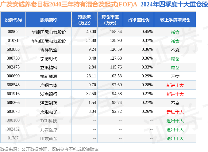从基金规模来看,广发安诚养老目标2040三年持有混合发起式(FOF)A基金2024年四季度公布的基金规模为3.38亿元,较上一期规模3.38亿元变化了6.61万元,环比变化了0.02%。该基金最新一期资产配置为:股票占净值比5.47%,债券占净值比7.49%,现金占净值比3.19%。从基金持仓来看,该基金当季前十大股票仓位达3.24%,第一大重仓股为华能国际电力股份(00902),持仓占比为0.45%。
