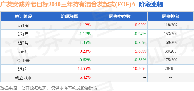 从业绩表现来看,广发安诚养老目标2040三年持有混合发起式(FOF)A基金过去一年净值涨幅为14.55%,在同类基金中排名28/183,同类基金过去一年净值涨幅中位数为10.36%。而基金过去一年的最大回撤为-9.75%,成立以来的最大回撤为-9.75%。