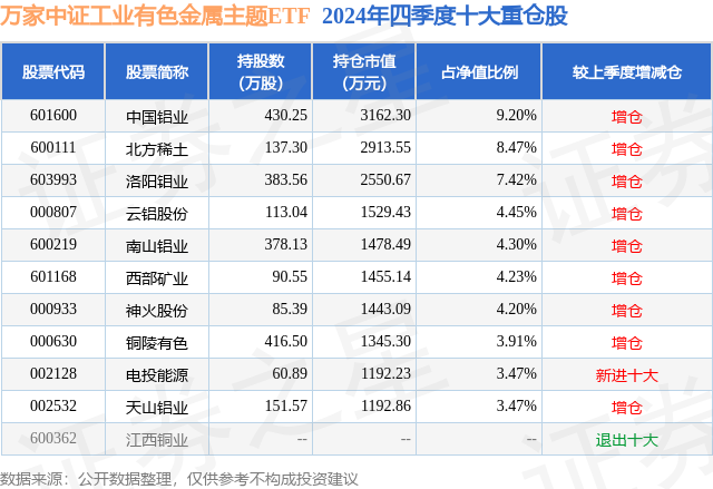 从基金规模来看,万家中证工业有色金属主题ETF基金2024年四季度公布的基金规模为3.44亿元,较上一期规模3.71亿元变化了-2671.31万元,环比变化了-7.21%。该基金最新一期资产配置为:股票占净值比98.61%,无债券类资产,现金占净值比1.5%。从基金持仓来看,该基金当季前十大股票仓位达53.12%,第一大重仓股为中国铝业(601600),持仓占比为9.2%。