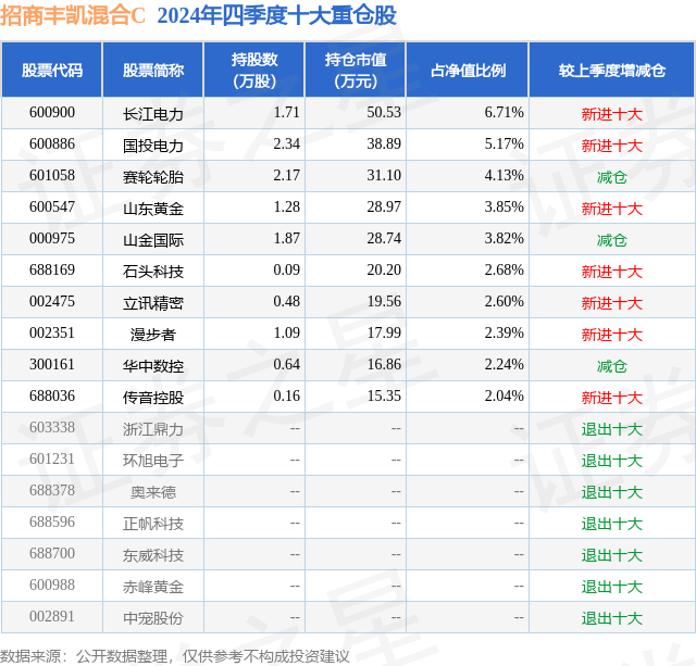 从基金规模来看,招商丰凯混合C基金2024年四季度公布的基金规模为0.04亿元,较上一期规模328.82万元变化了75.78万元,环比变化了23.05%。该基金最新一期资产配置为:股票占净值比41.91%,债券占净值比5.43%,现金占净值比53.0%。从基金持仓来看,该基金当季前十大股票仓位达35.63%,第一大重仓股为长江电力(600900),持仓占比为6.71%。