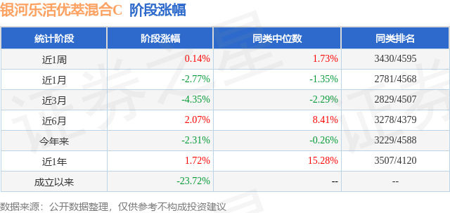 从业绩表现来看,银河乐活优萃混合C基金过去一年净值涨幅为1.72%,在同类基金中排名3507/4120,同类基金过去一年净值涨幅中位数为15.28%。而基金过去一年的最大回撤为-25.22%,成立以来的最大回撤为-33.84%。
