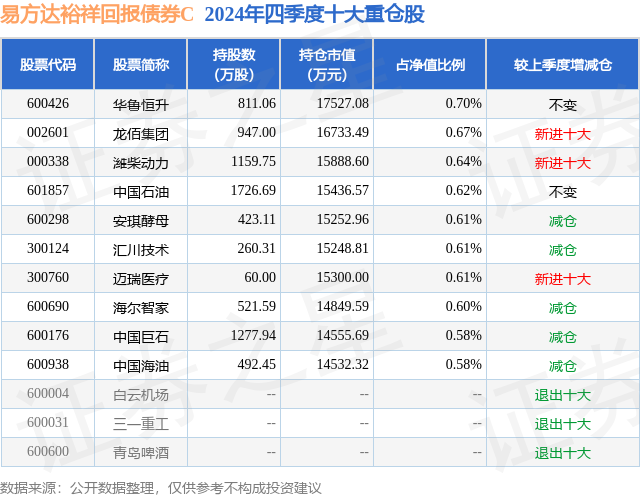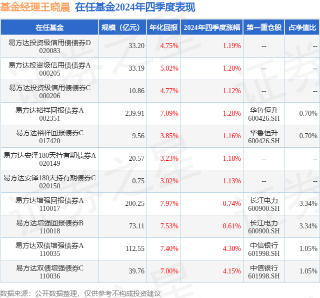 从基金规模来看,易方达裕祥回报债券C基金2024年四季度公布的基金规模为9.56亿元,较上一期规模5.12亿元变化了4.45亿元,环比变化了86.84%。该基金最新一期资产配置为:股票占净值比19.65%,债券占净值比83.19%,现金占净值比0.16%。从基金持仓来看,该基金当季前十大股票仓位达6.22%,第一大重仓股为华鲁恒升(600426),持仓占比为0.7%。
