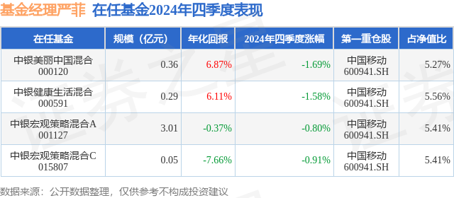 证券之星消息,日前中银美丽中国混合基金公布四季报,2024年四季度最新规模0.36亿元,季度净值涨幅为-1.69%。