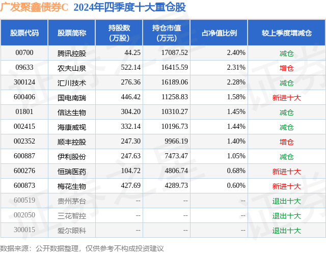 从基金规模来看,广发聚鑫债券C基金2024年四季度公布的基金规模为6.78亿元,较上一期规模6.97亿元变化了-1919.6万元,环比变化了-2.76%。该基金最新一期资产配置为:股票占净值比19.58%,债券占净值比97.08%,现金占净值比0.56%。从基金持仓来看,该基金当季前十大股票仓位达15.19%,第一大重仓股为腾讯控股(00700),持仓占比为2.4%。