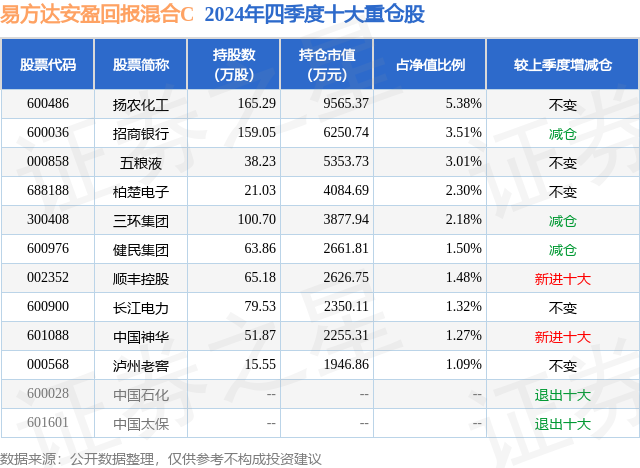 从基金规模来看,易方达安盈回报混合C基金2024年四季度公布的基金规模为0.26亿元,较上一期规模6204.62万元变化了-3583.64万元,环比变化了-57.76%。该基金最新一期资产配置为:股票占净值比25.23%,债券占净值比71.19%,现金占净值比0.48%。从基金持仓来看,该基金当季前十大股票仓位达23.04%,第一大重仓股为扬农化工(600486),持仓占比为5.38%。