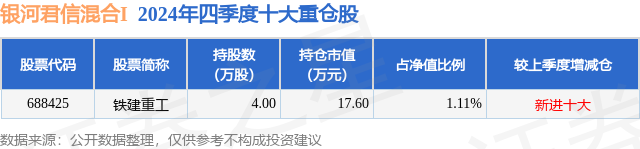 证券之星消息,日前银河君信混合I基金公布四季报,2024年四季度最新规模0.04亿元,季度净值涨幅为6.06%。