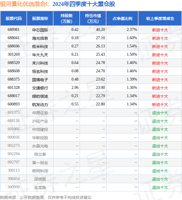 从基金规模来看,银河量化优选混合C基金2024年四季度公布的基金规模为0.0亿元,较上一期规模3.99万元变化了26.2万元,环比变化了656.36%。该基金最新一期资产配置为:股票占净值比70.17%,无债券类资产,现金占净值比30.16%。从基金持仓来看,该基金当季前十大股票仓位达15.36%,第一大重仓股为中芯国际(688981),持仓占比为2.37%。